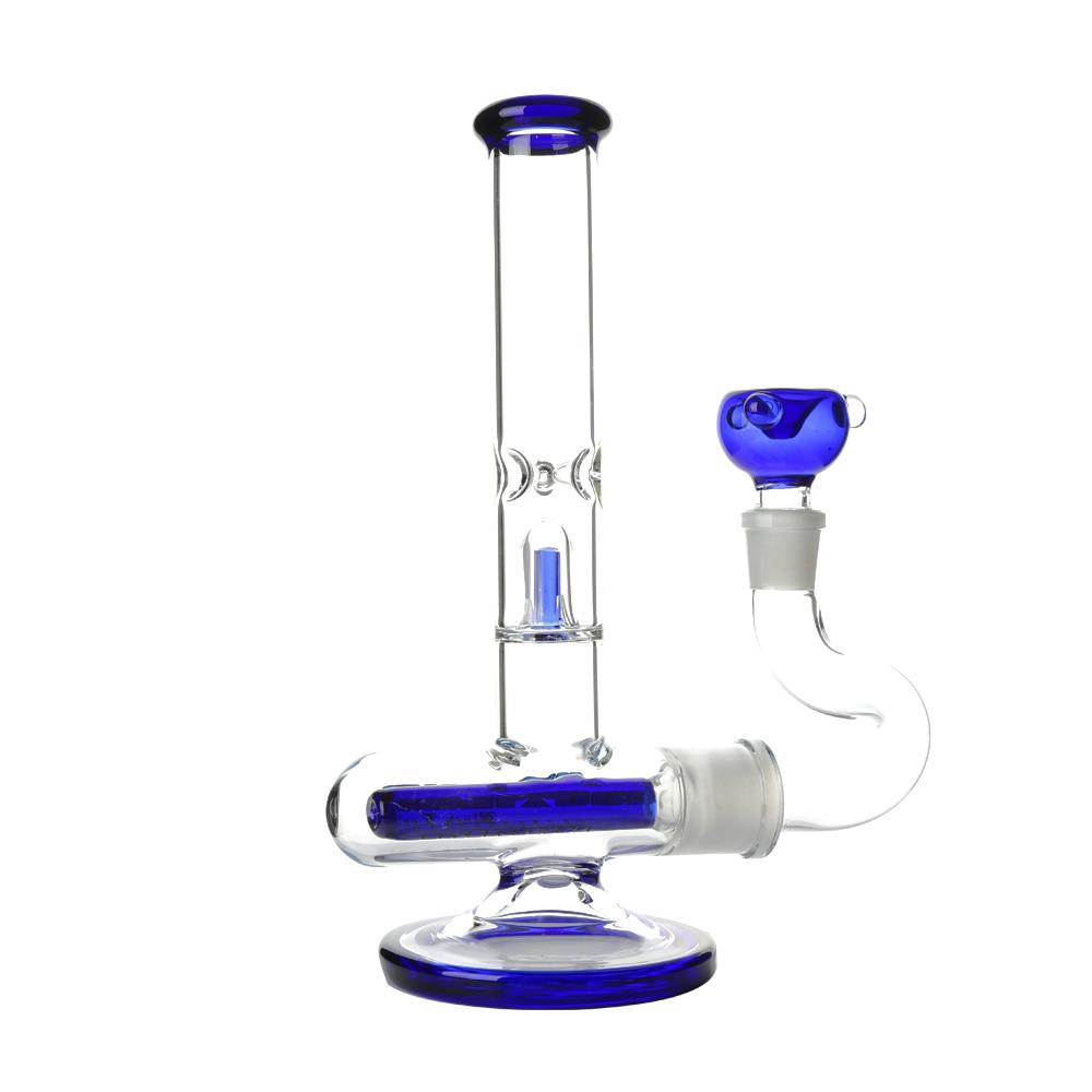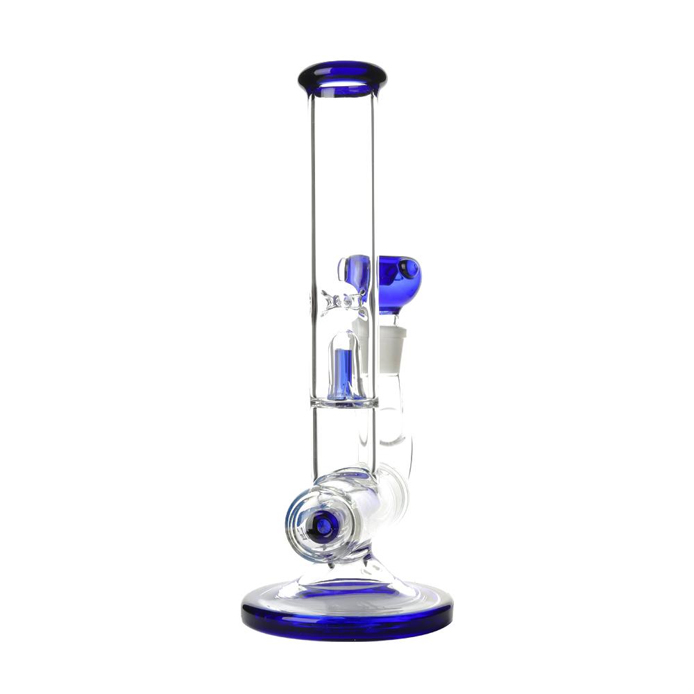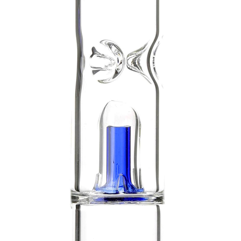The perc is easily removed for cleaning as it forms part of the downpipe adaptor. Moving up the straight tube there is a 4 slit splash guard which is placed just below the ice notches. The mouthpiece, percolator, splash guard and glass bowl are all cobalt blue in colour and the bowl includes ‘roll stop’ nodules to prevent it rolling around.
