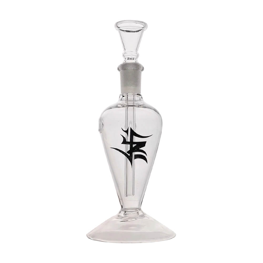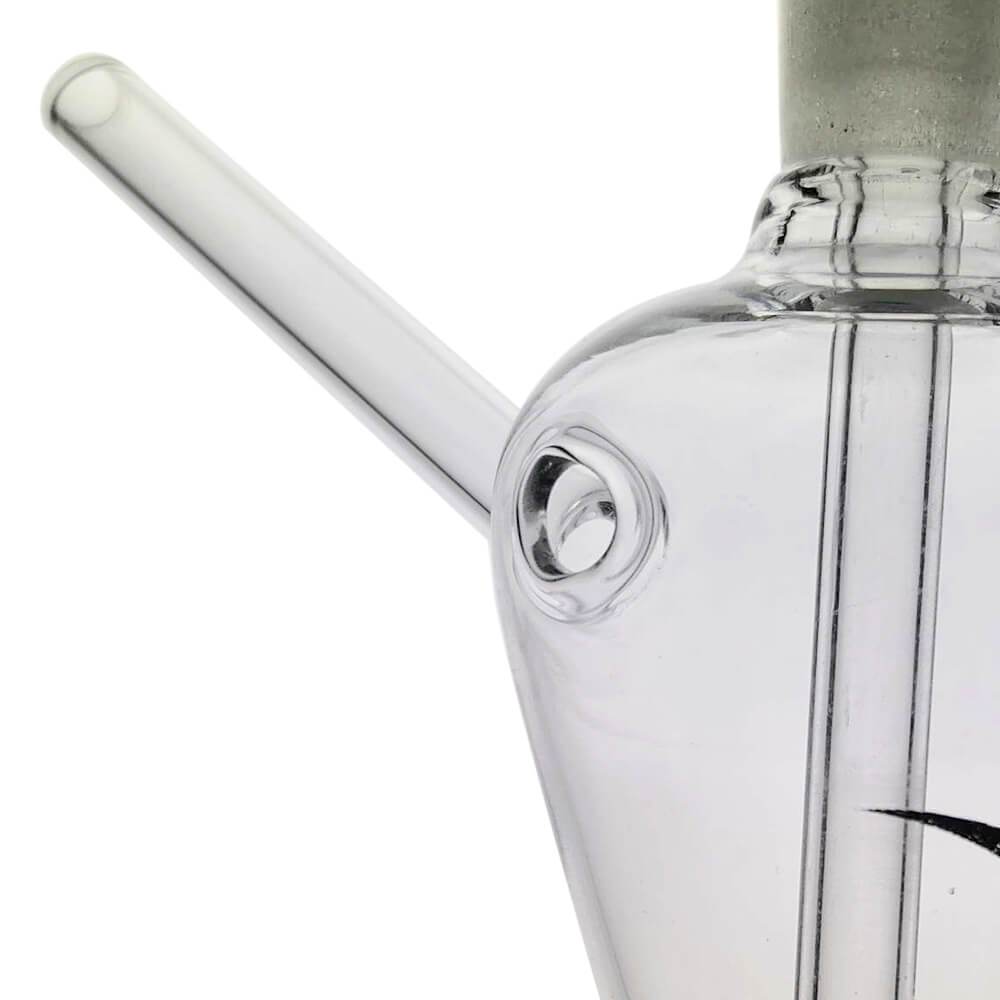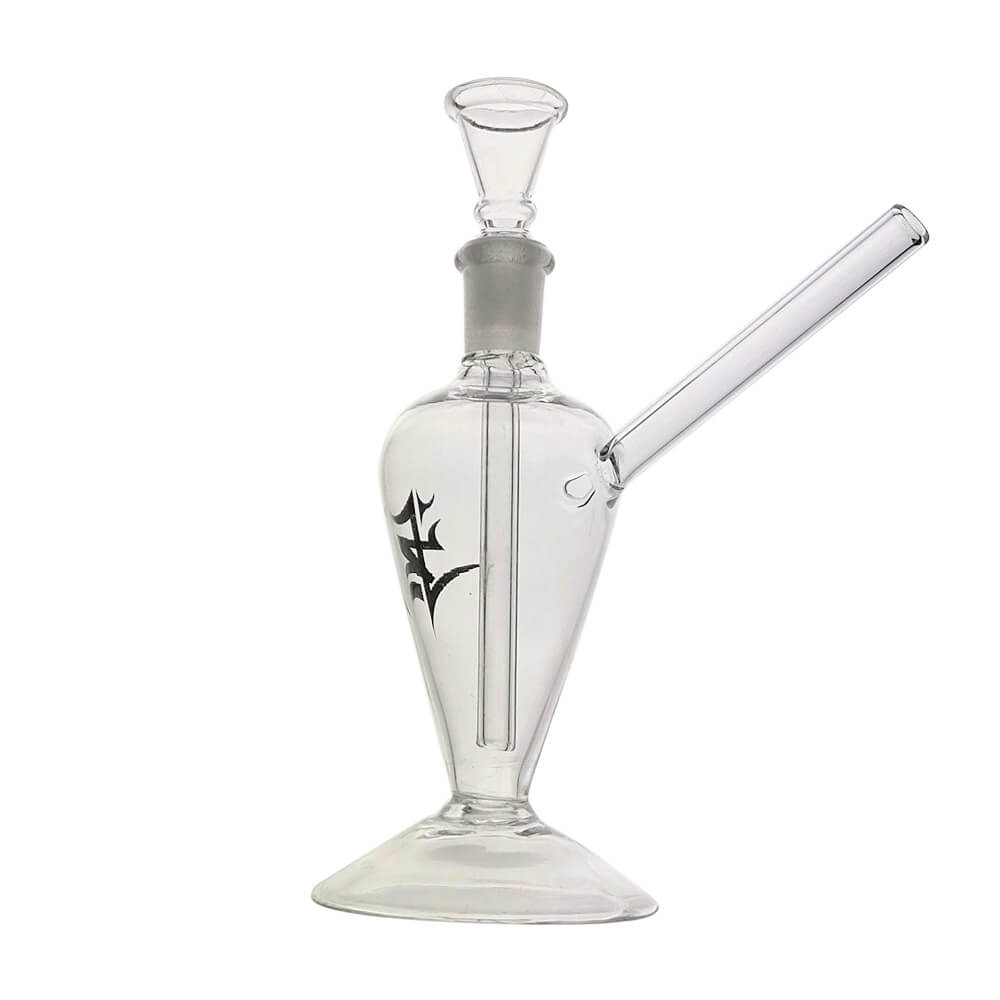 This Mini Borosilicate Glass Bong has an almost champagne glass-style base, with the bubble growing out of the cylindrical foot. The bowl sits atop the peak of the bubble with a long mouthpiece jutting out from the side.