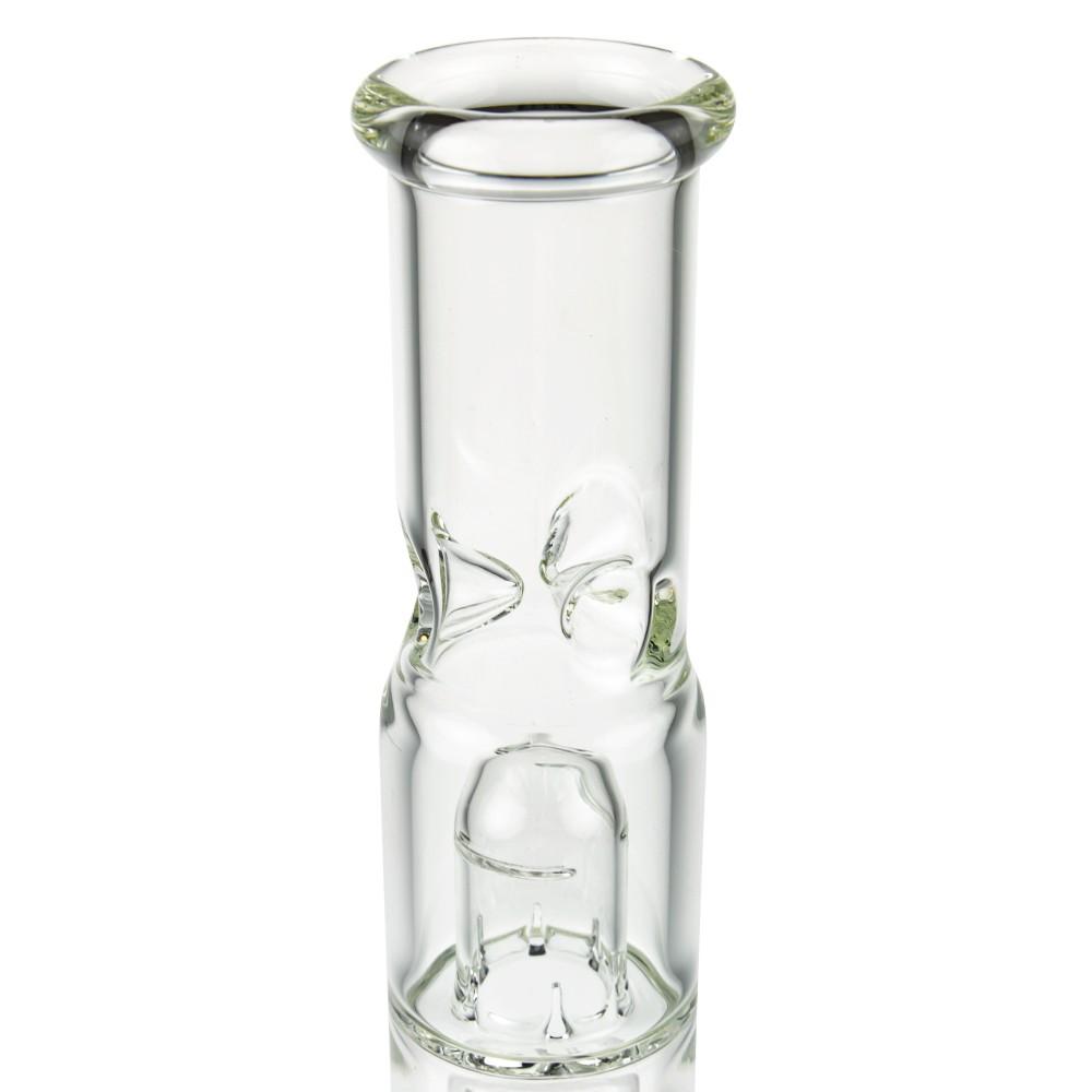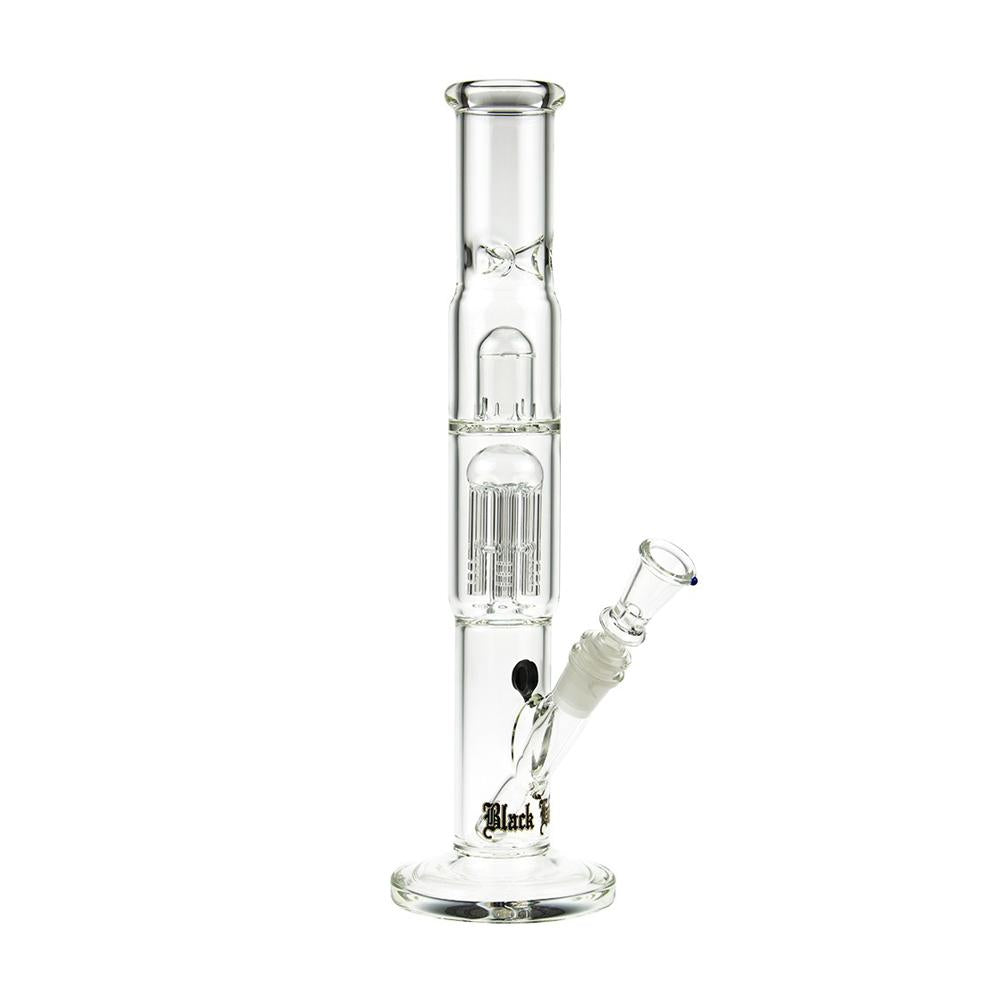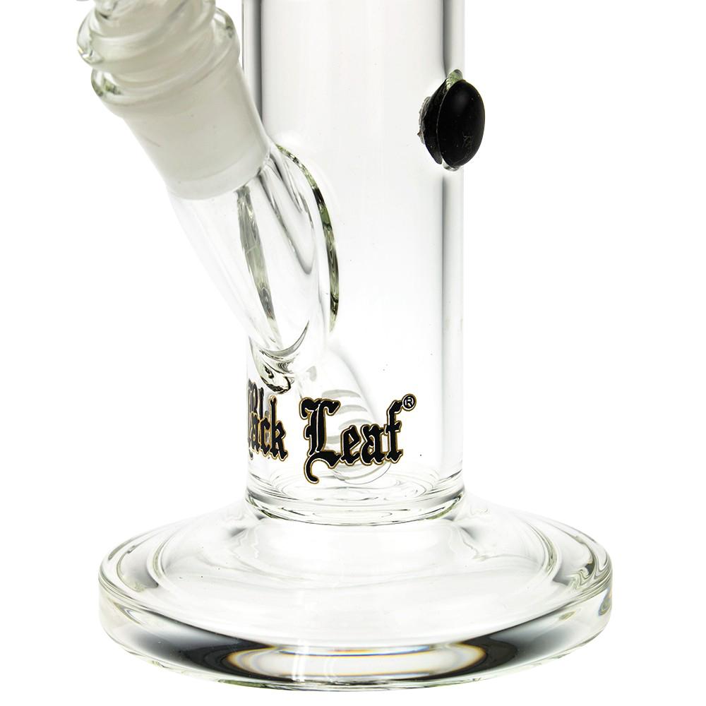 Using 5mm thick glass, this Black Leaf Glass straight Bong features clear glass expanded sections and a clear glass 6-arm tree perc to guarantee a smooth experience each and every time. It also features a splash guard and a slide/bowl that is not shown on the picture.