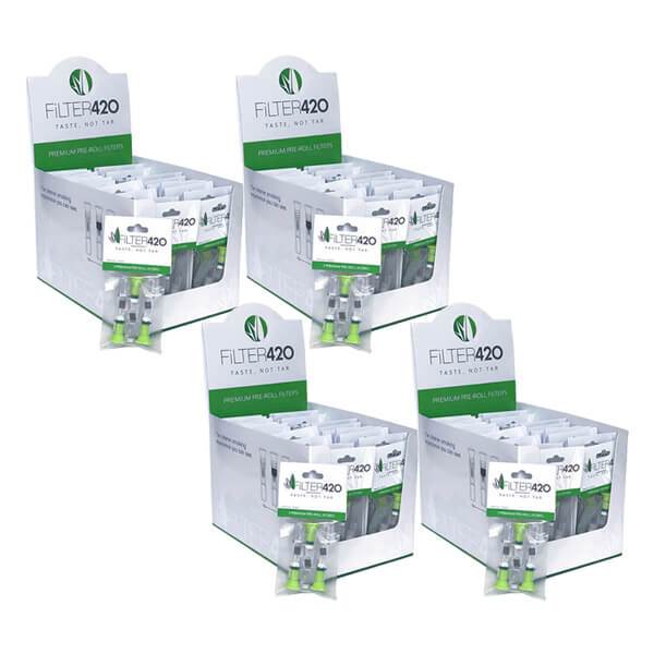 These Premium Pre-Roll Filters from Filter420 take away the majority of the tar and toxins produced by smoking, leaving you with nothing but a smooth smoke full of flavour everytime! Buy this in bulk as you will receive 4 cases of 35 packets which equals 140 packets with 3 filters in each packet.The Premium Pre-Roll Filters are made up of three main parts, the mouthpiece, the chamber and the tip. The tip is the part which connects the filter to your joint, within the tip is a restricted opening inside the first chamber which the smoke is pulled through as you inhale. After the smoke has travelled through the first chamber, it is then pulled into the chamber which throws the harmful tar solids outwards towards the the inside of the filter body as the air expands within the chamber. In the chamber is where most of the toxins are collected. As the smoke then travels into the mouthpiece, there are silicone beads which catch remaining tar before the smoke travels into the sterile mouthpiece.Whether you want to stop that cough that always seems to appear when you smoke, want to reduce the harshness or just want to feel a little healthier when smoking, the Premium Pre-Roll Filters are for you! Order today to start enjoying the flavour and smoothness of a filtered smoke.