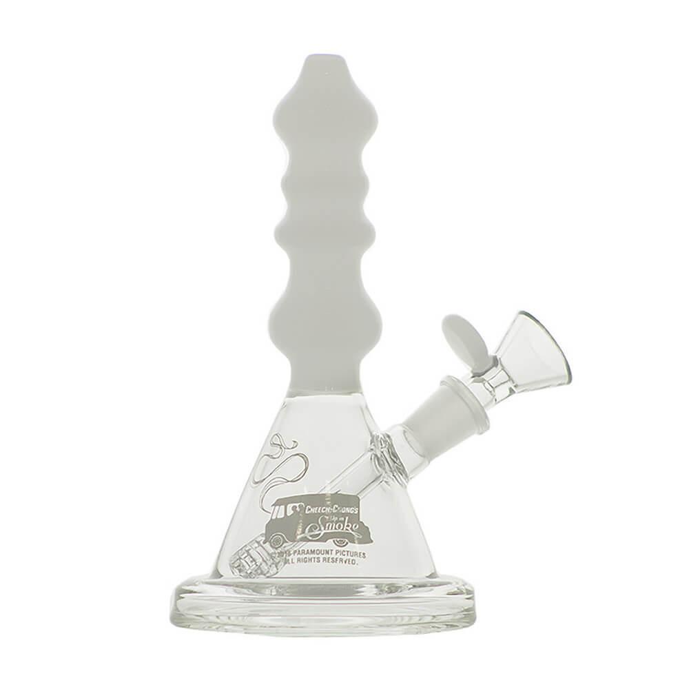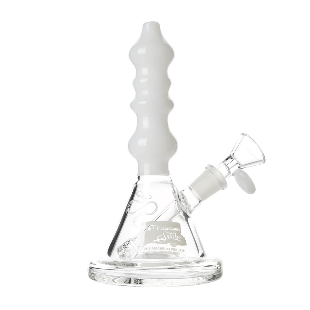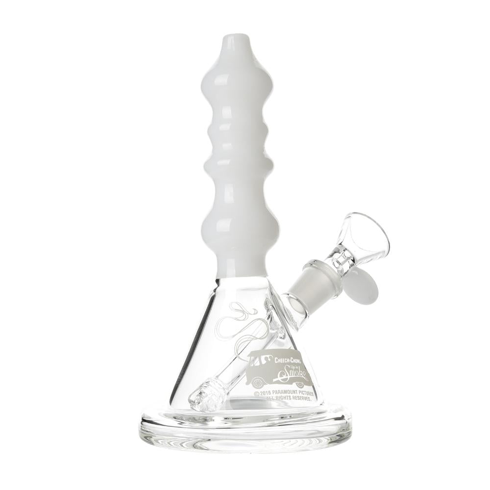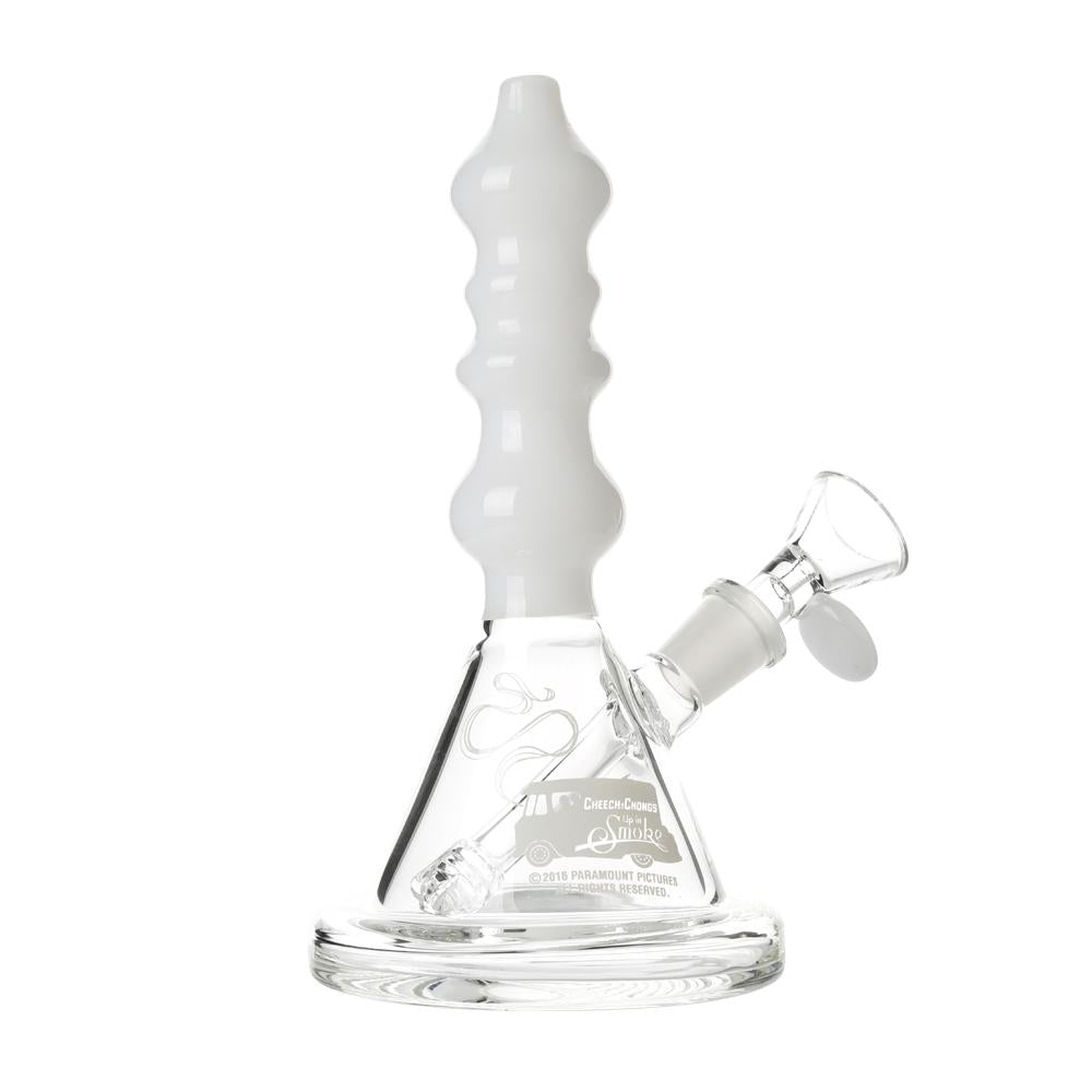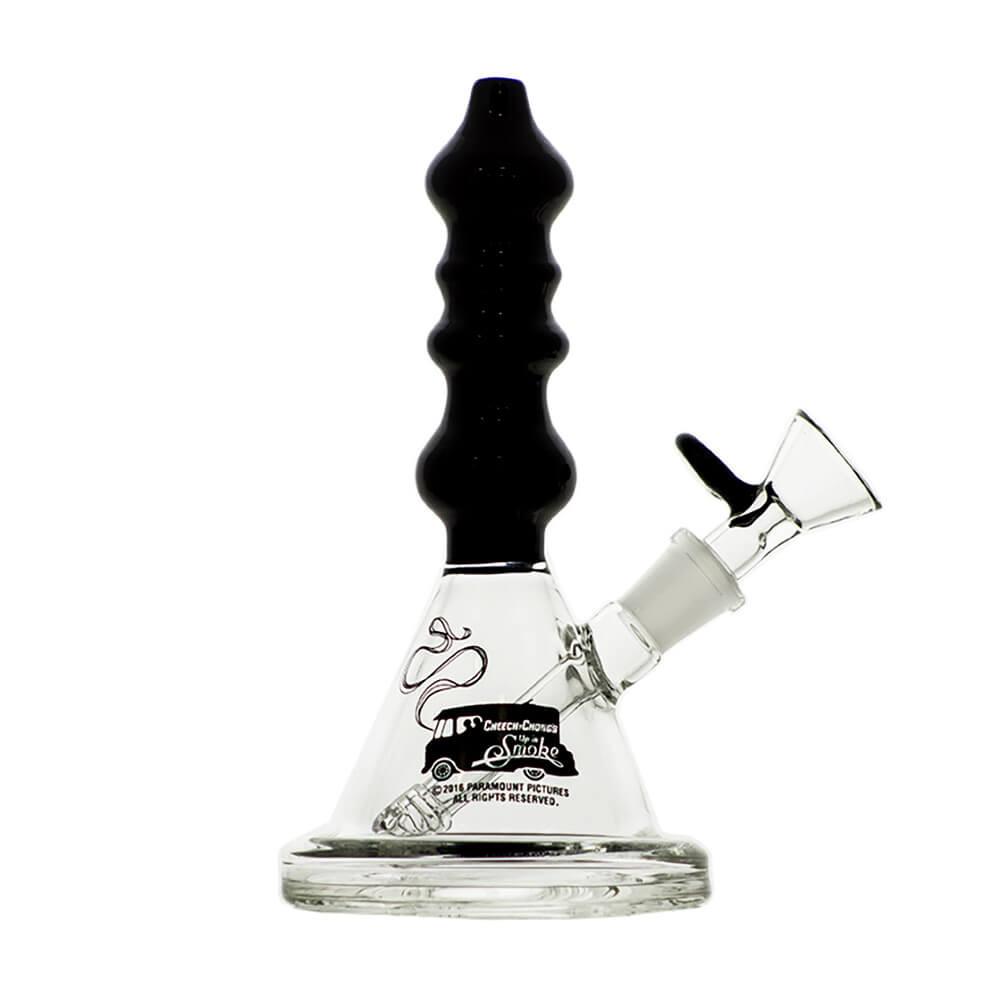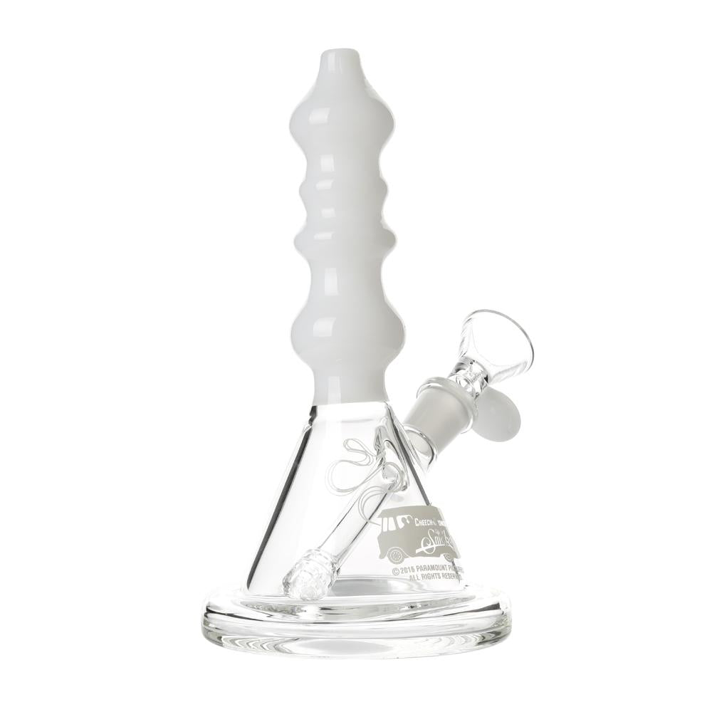 The Sgt. Stadenko is just as much of a one off as the man himself. The beaker base looks fairly normal and does it's job of increasing capacity to give you bit fat rips, but the neck is totally out there with pinched sections that cause the smoke to cool and increase in density as it rises. You can choose between white detailing and black detailing and whatever color neck you choose they also print the Cheech and Chong Up In Smoke logo on the side in the same color to keep the lok going all the way through the piece. The fixed downstem has a diffuser at it's base to break up the bubbles and they include a 14.4mm male flower bowl to complete the set. Choose either Black or White from the dropdown menu above.