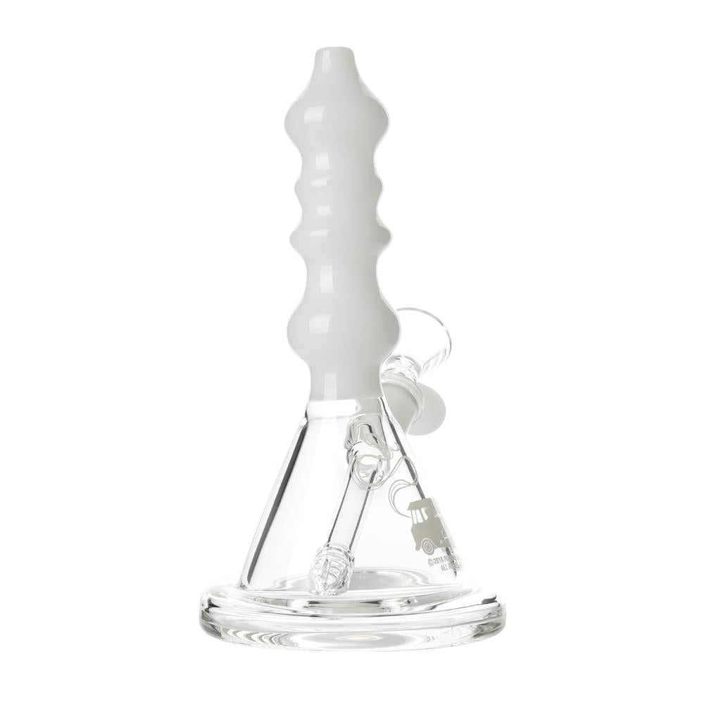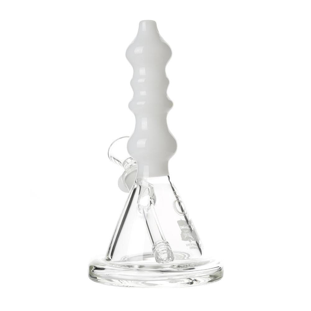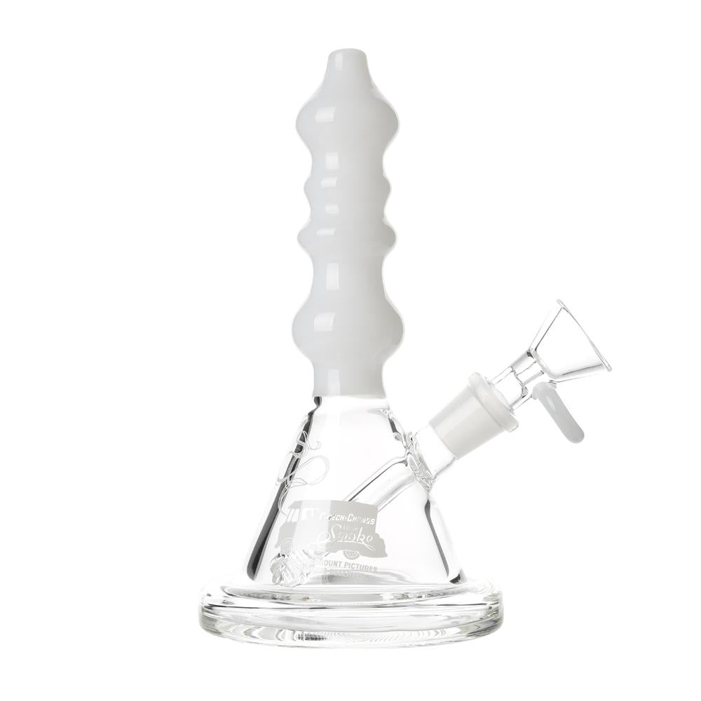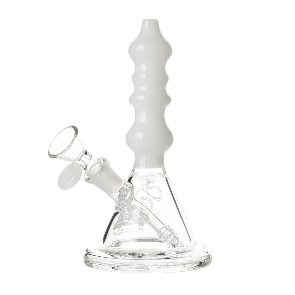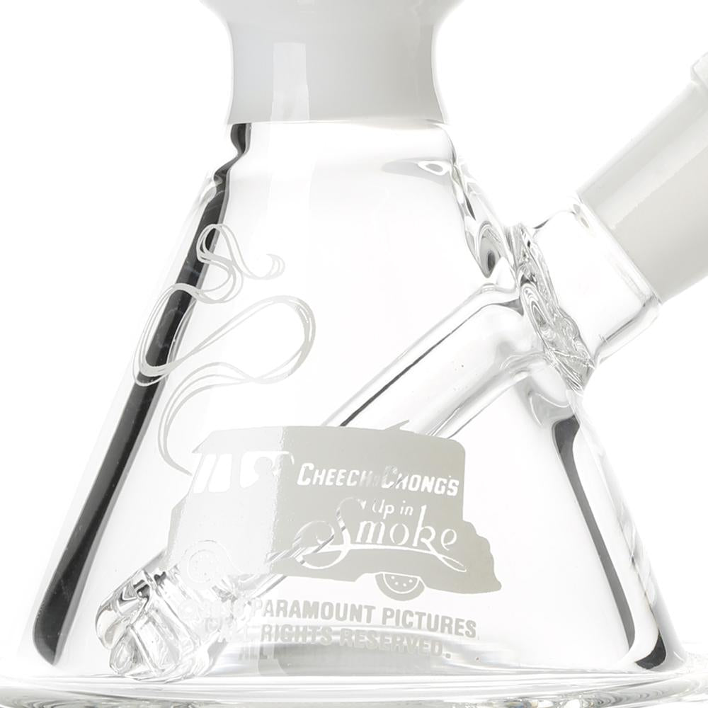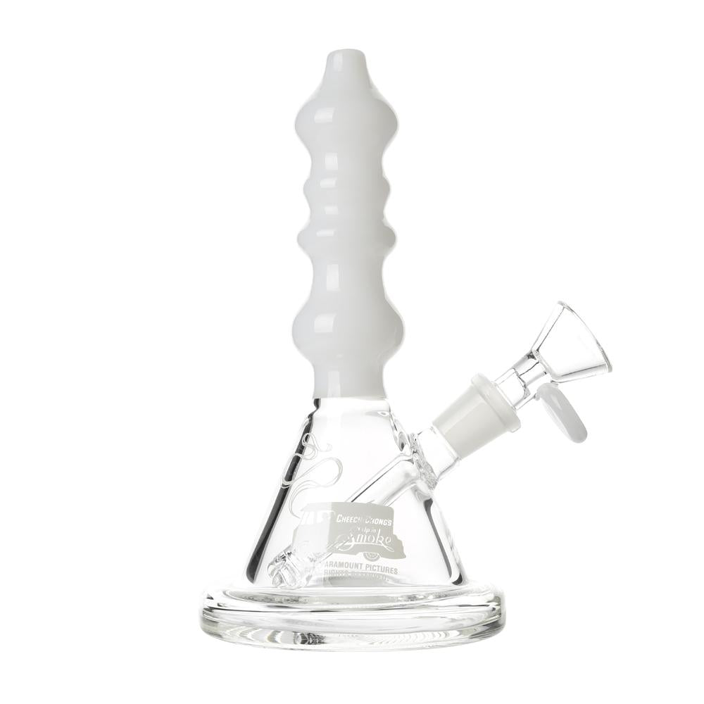 The Sgt. Stadenko is just as much of a one off as the man himself. The beaker base looks fairly normal and does it's job of increasing capacity to give you bit fat rips, but the neck is totally out there with pinched sections that cause the smoke to cool and increase in density as it rises. You can choose between white detailing and black detailing and whatever color neck you choose they also print the Cheech and Chong Up In Smoke logo on the side in the same color to keep the lok going all the way through the piece. The fixed downstem has a diffuser at it's base to break up the bubbles and they include a 14.4mm male flower bowl to complete the set. Choose either Black or White from the dropdown menu above.