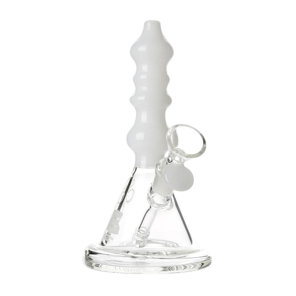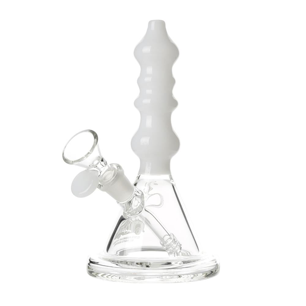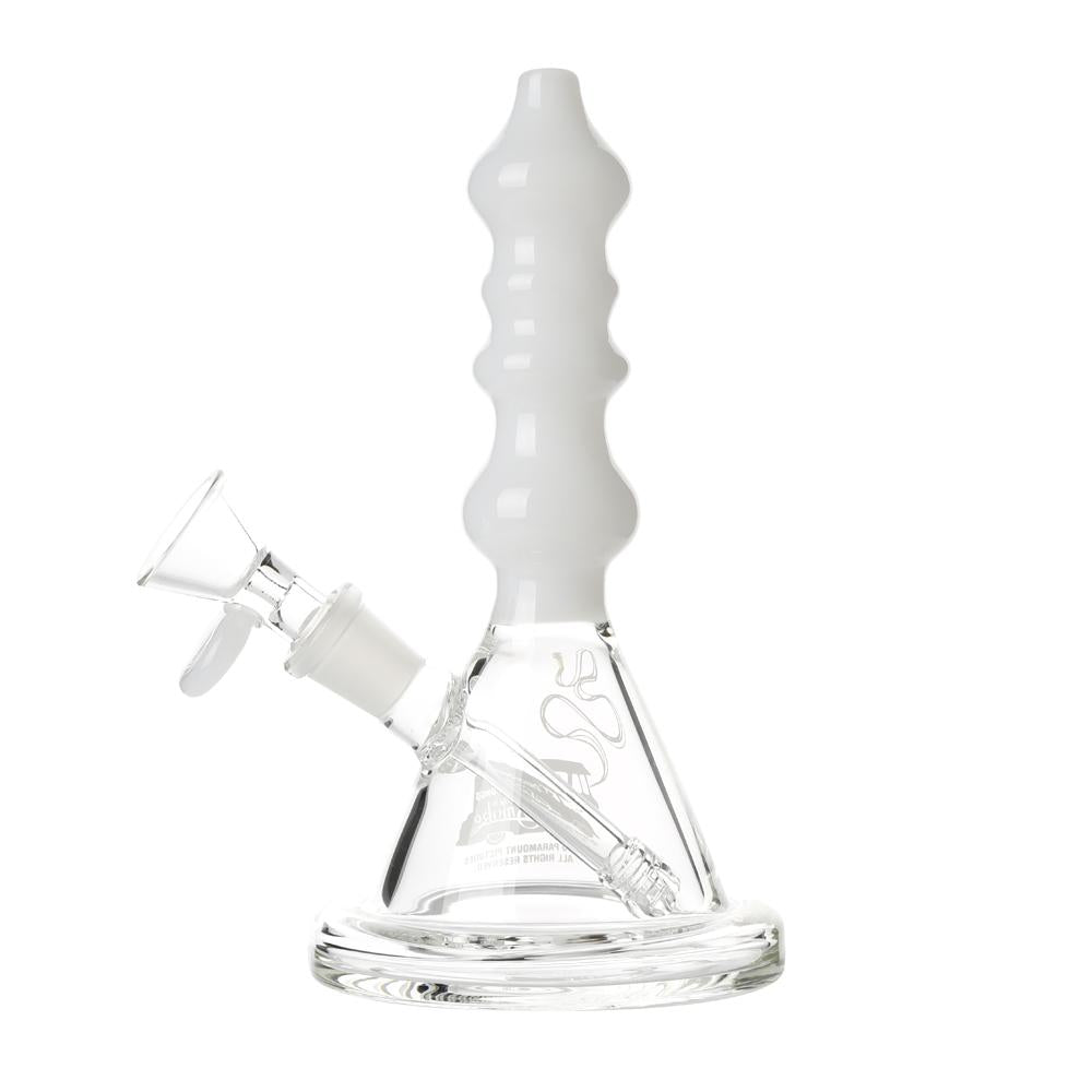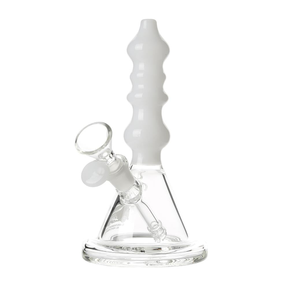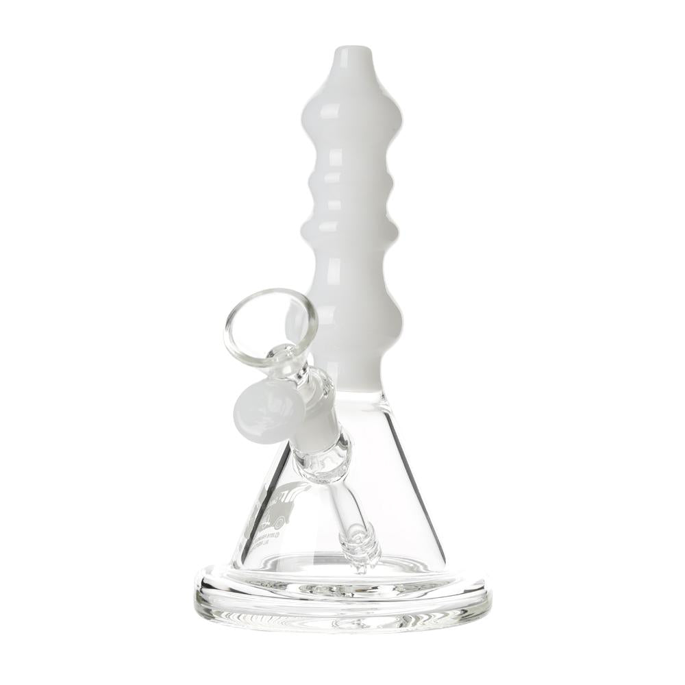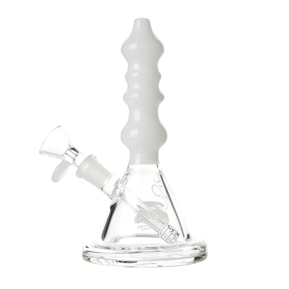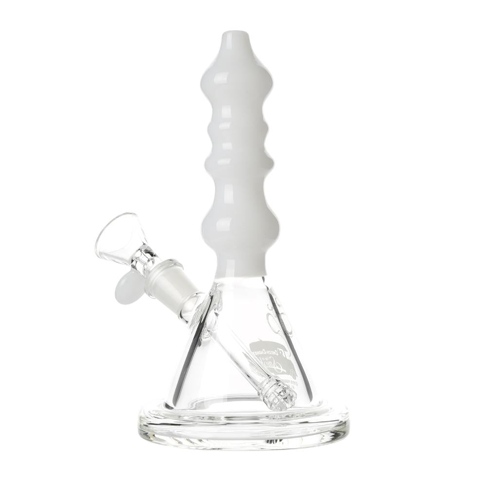 The Sgt. Stadenko is just as much of a one off as the man himself. The beaker base looks fairly normal and does it's job of increasing capacity to give you bit fat rips, but the neck is totally out there with pinched sections that cause the smoke to cool and increase in density as it rises. You can choose between white detailing and black detailing and whatever color neck you choose they also print the Cheech and Chong Up In Smoke logo on the side in the same color to keep the lok going all the way through the piece. The fixed downstem has a diffuser at it's base to break up the bubbles and they include a 14.4mm male flower bowl to complete the set. Choose either Black or White from the dropdown menu above.