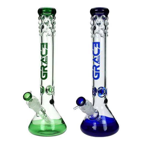 The 7mm Grace Bong is a beautifully crafted piece of glass, comes with full colour co-ordination. The 7mm thick glass has a coloured rim, with marbles on the tube, the Grace Glass logo, proudly sits above the ice notches. The beaker base is half coloured and half clear through which you can clearly see the 6 arm diffusing perc downstem, as standard. The bowl goes from 18.8mm through a reducing downtube into the built in perc.