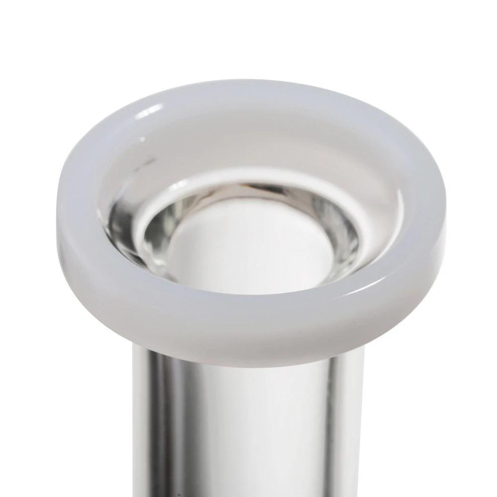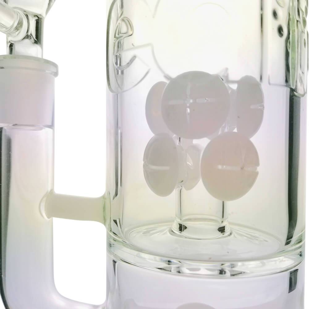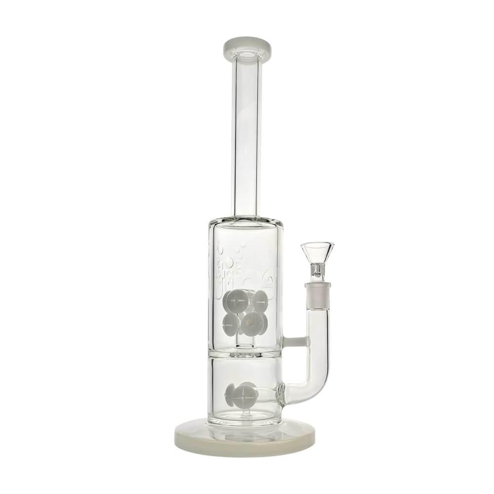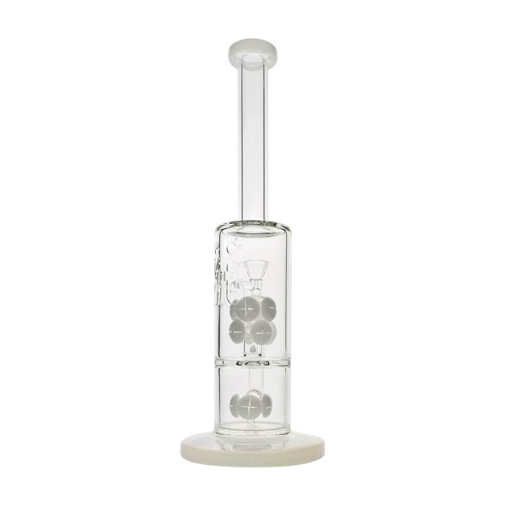 This piece is built with two chambers and multiple cross percolators, it is designed to provide the user with the coolest and smoothest hit possible. Filtering the smoke not once but twice, the bottom chamber’s cross percolator forces the smoke to increase in surface area allowing the water to cool it more effectively. Due to the suction, this smoke then passes through to the next chamber where the filtration process reoccurs. The eventual outcome is a cool, clean smoking experience for the user