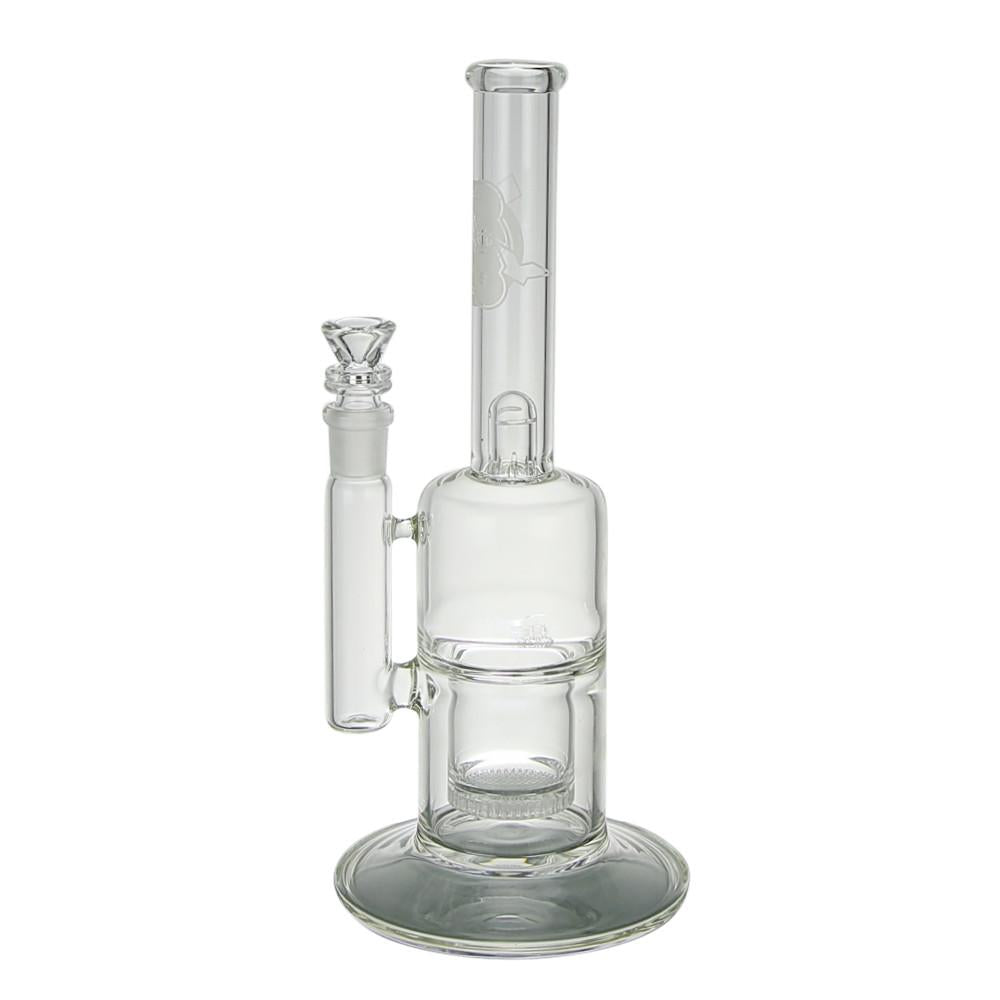 This scientific, dual percolator bong from HVY Glass is equipped with a multi hole disc perc which feeds an 8-arm tree percolator. Features an integrated splashguard, 18.8mm female ground joint and matching bowl slide.